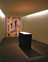 The shaft of light strikes the stone in a room of utter simplicity. There are no other symbols, there is nothing to distract our attention or to break in on the stillness within ourselves. When our eyes travel from these symbols to the front wall, they meet a simple pattern opening up the room to the harmony, freedom and balance of space.