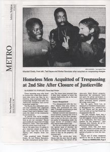 As the first anti-government oppression movement of homeless persons, consisting of US citizen civilians military veterans, and foreign guests, the aggressive, peaceful activism of Justiceville, in partnership with the LA American Civil Liberties Union (ACLU), inadvertently led to the infamous, October 1985, “Defense of Necessity” court decision.