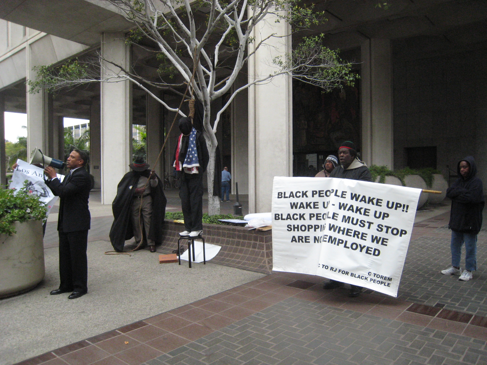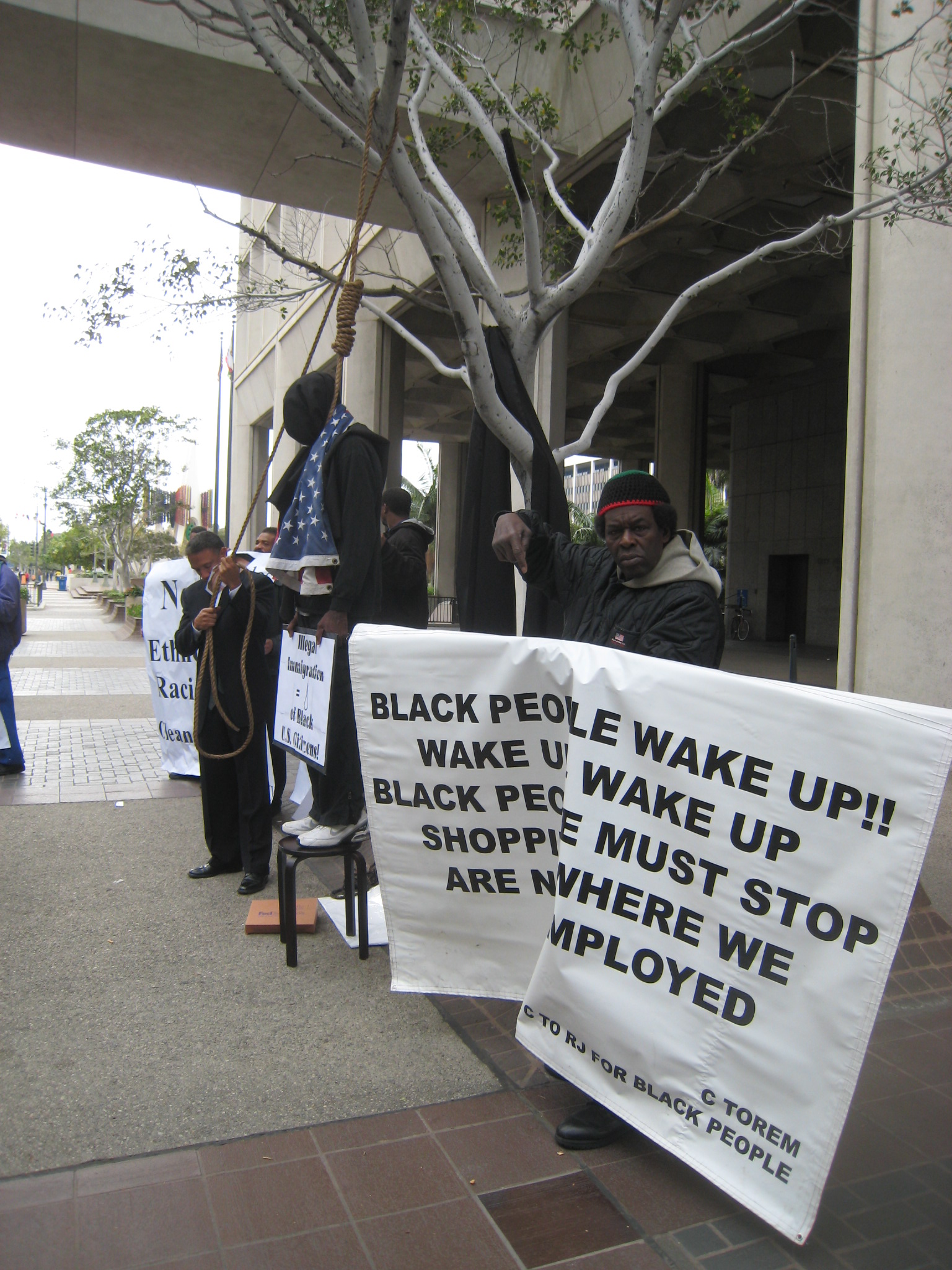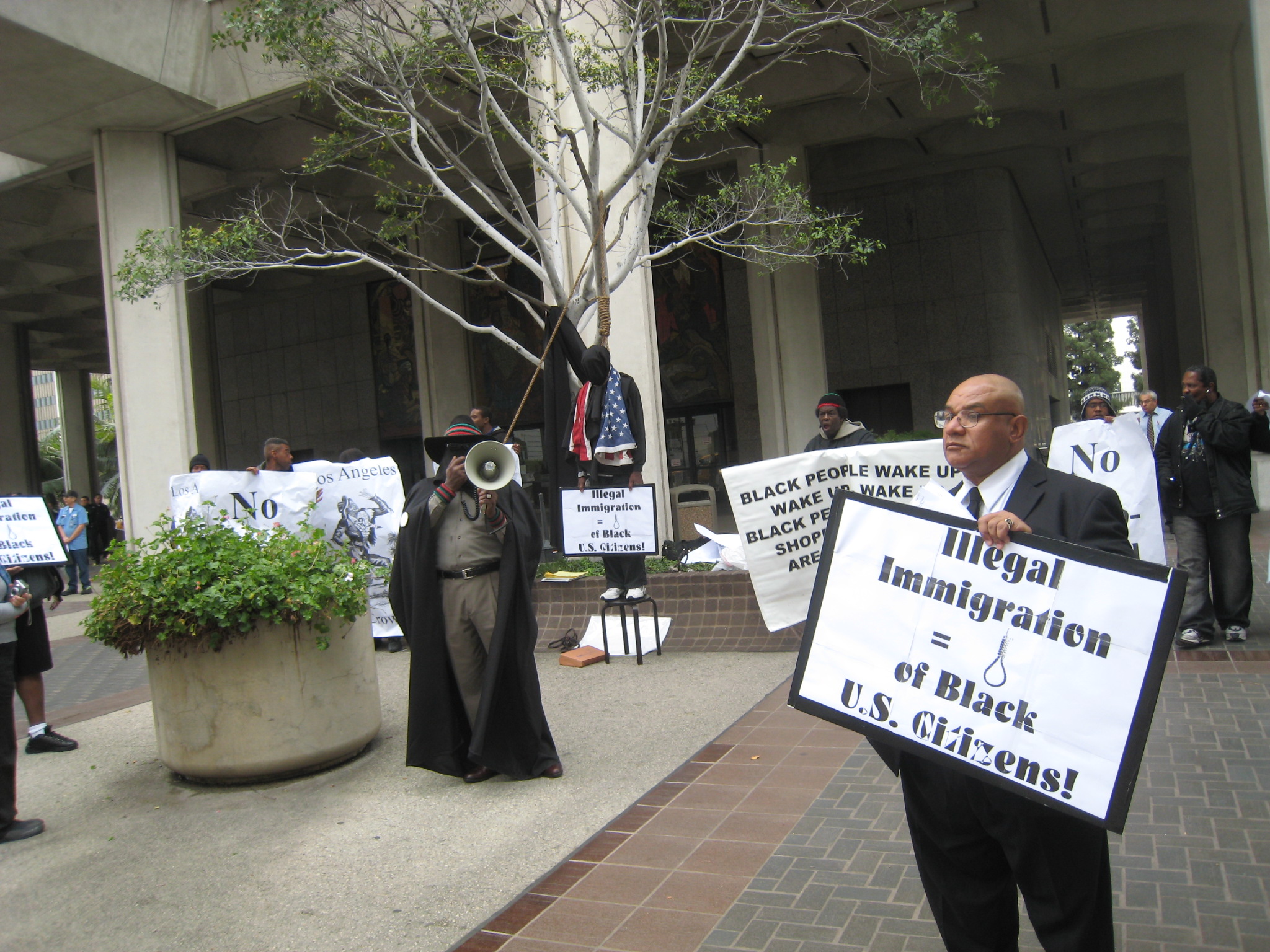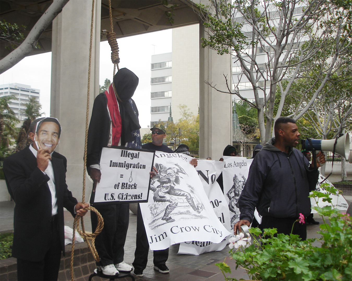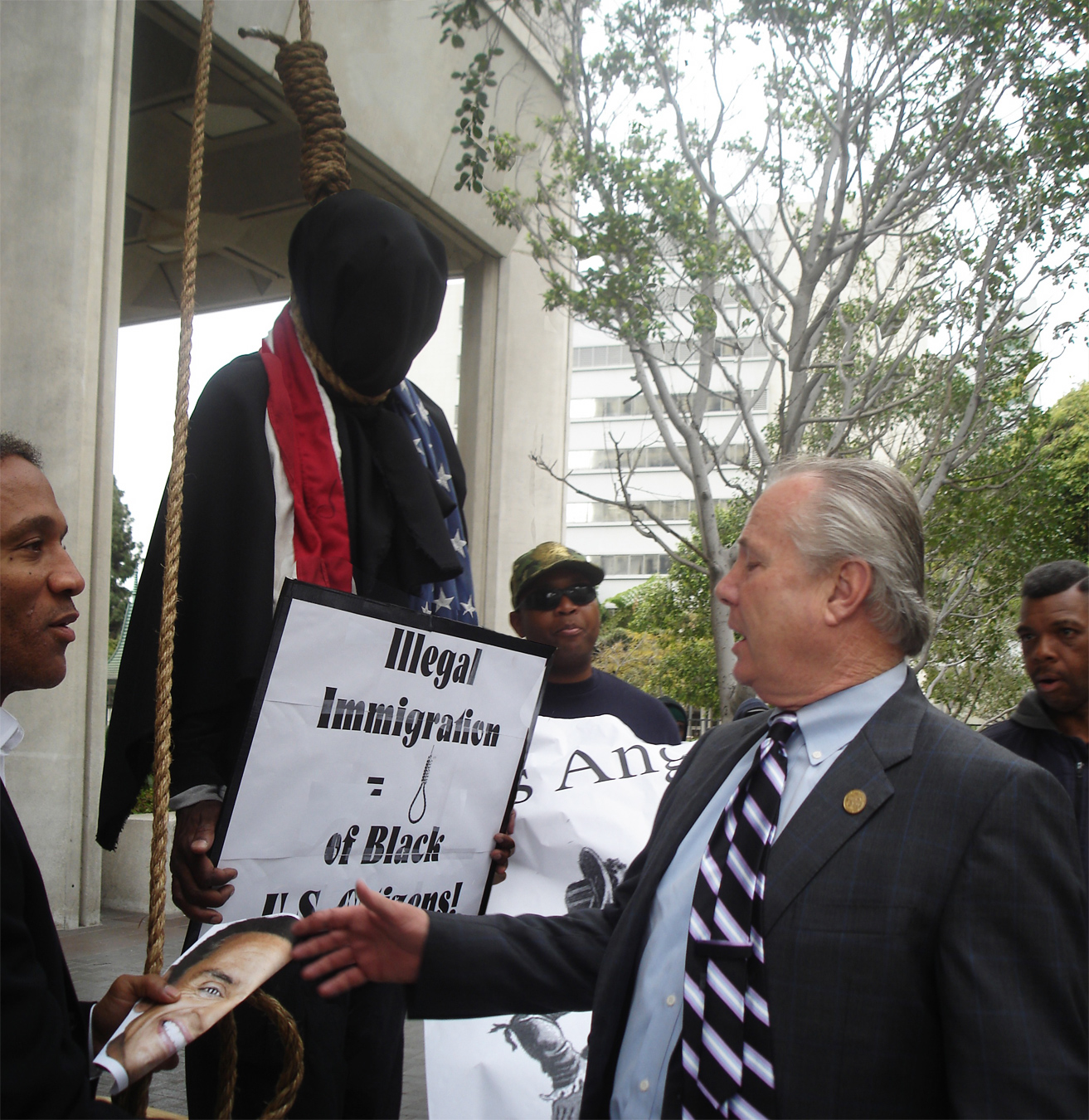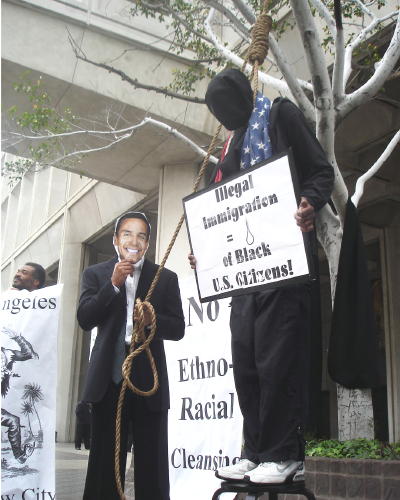 about the "Lynching" of the Black man in front of LA City Hall. While American history, especially that of the "old" West is filled with images of lynching...most particular mob lynching, which in many cases were Anglo-Whites individuals, however, rightly so, the noose has a most special place in the psyche of Blacks as everybody know. The Last Civil Rights Activists have taken it upon themselves to utilize that dramatic and emotional iconic image as a tool to startle Blacks and all of America the grave danger of illegal immigration |