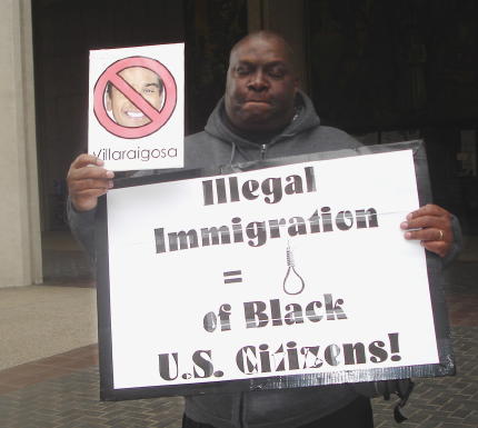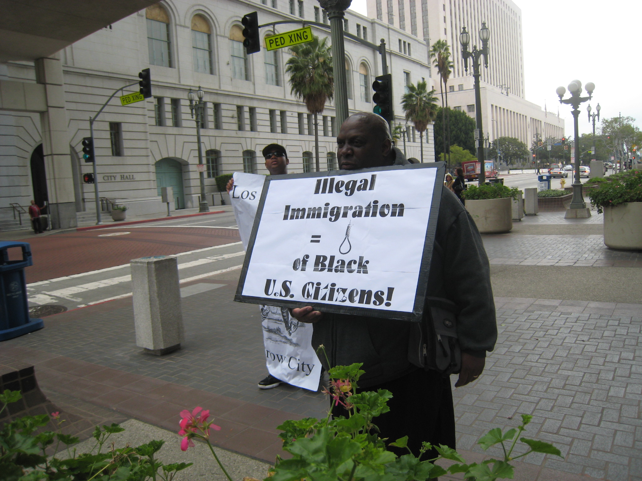 Atune Re, associate of "The Last Civil Rights Activists" also holding signs reading "Illegal Immigration = the "lynching" of Black US citizens Citizens of foreign nations are unlawfully removing Black US citizens from our rightful place in Los Angeles and American society, replacing us with themselves. |