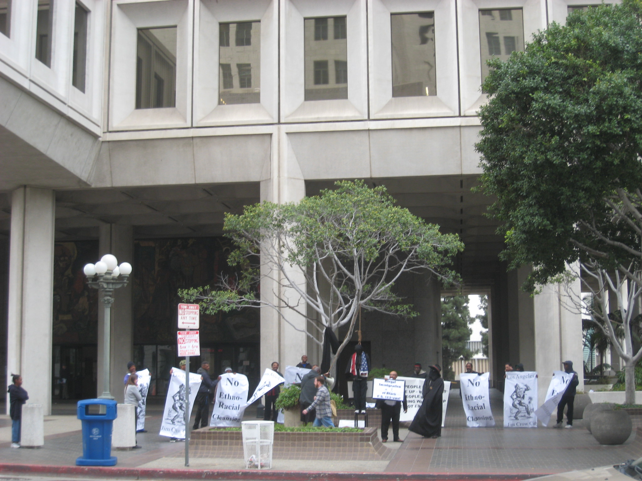 This view is scene from the west side of the Main Street where LA City Hall proper is located. It is rumored that the Mayor Antonio Villariagosa came down from his 3rd floor office to view his living effigy "lynching" the Black Man also in living effigy. Of course, instead of confronting us, "after we called him out", ran back upstairs, instead being a leader and dealing with the situation. |