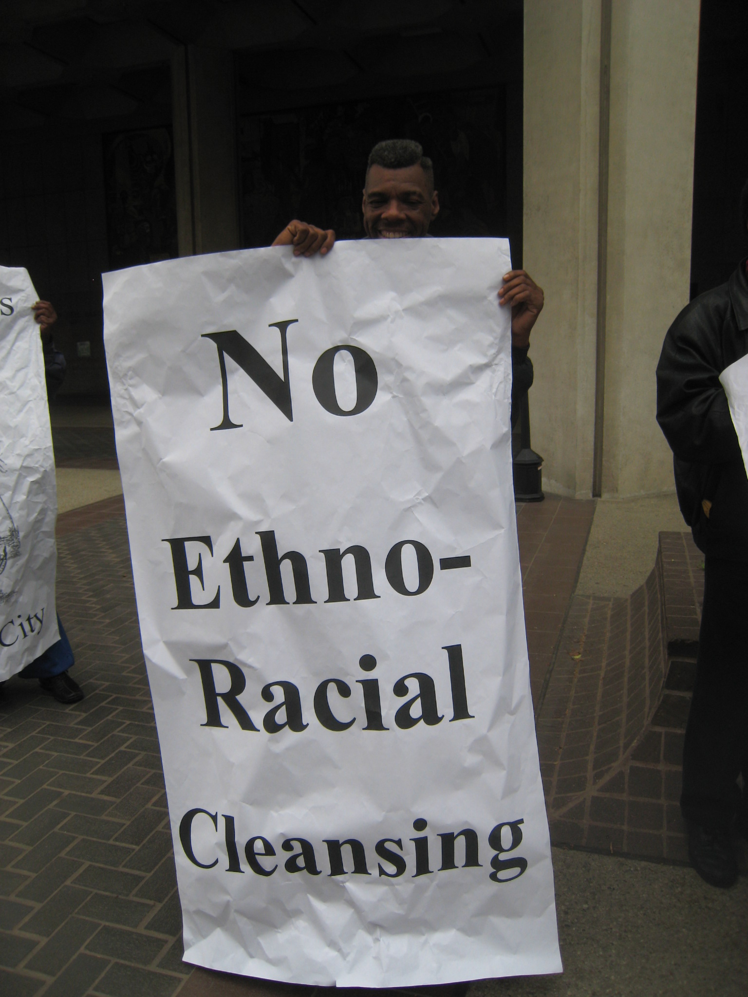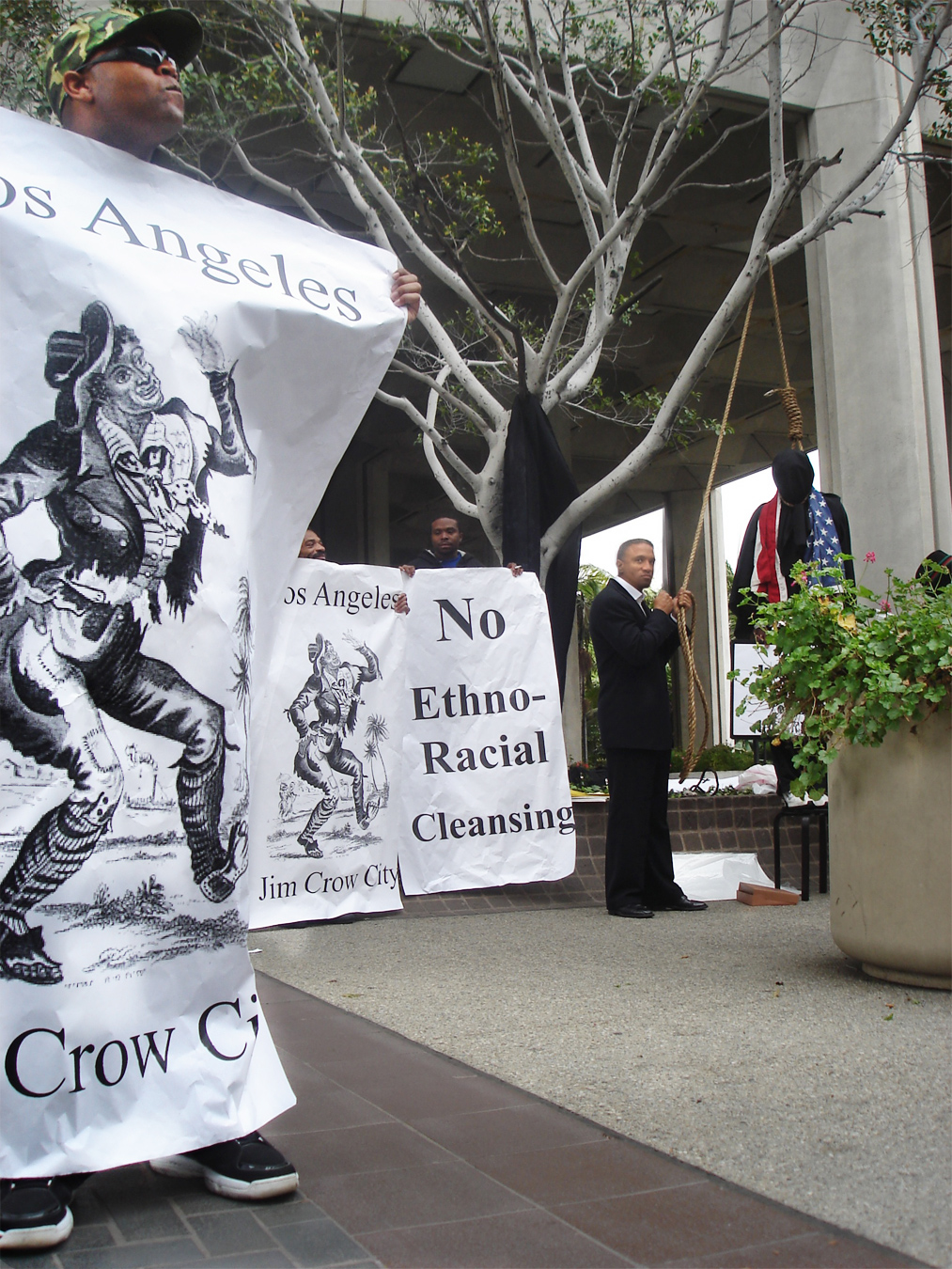 | In Los Angeles, Blacks must assume the roles of either "sell-out" Jim Crow type minstrels of comedy, entertainment and sports; even wearing sagging, "underwear showing" pants; gangster and commercialized clothing fit for clowns; or be gagged and suppressed employees of the City government and the Los Angeles Unified School District (LAUSD), such as most of the African American elected and appointed officials who refuse to stop the Ethno-Racial Cleansing - "lynching" of Blacks. |