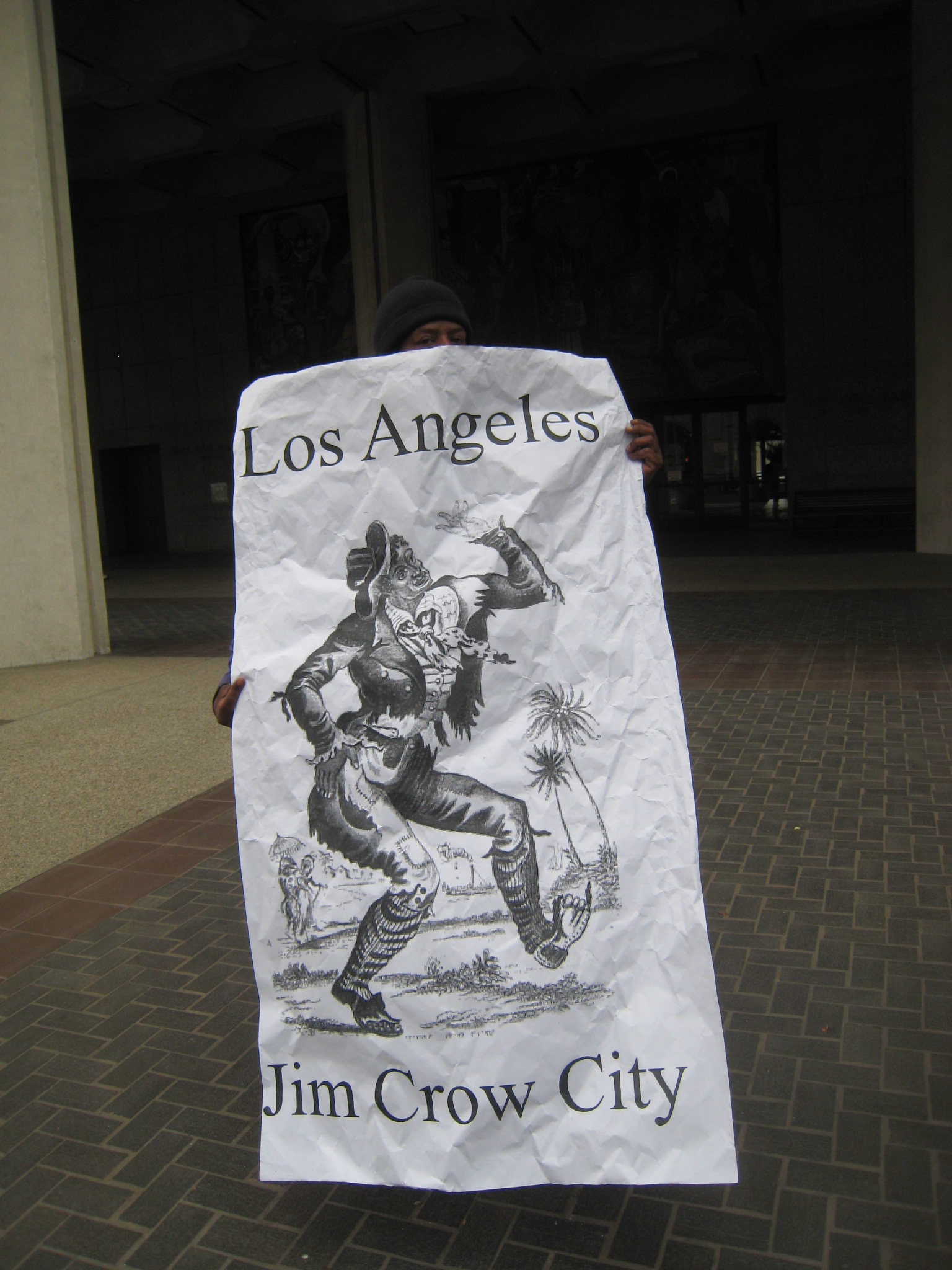 One of the unidentified Homeless volunteers holding the "Los Angeles - Jim Crow City" signs